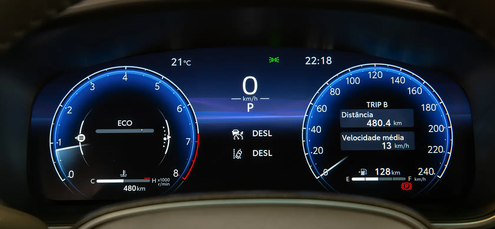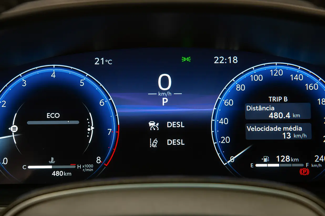 Grade frontal estilo colmeia com faróis dianteiros de LED com luzes diurnas e indicador de direção sequencial.