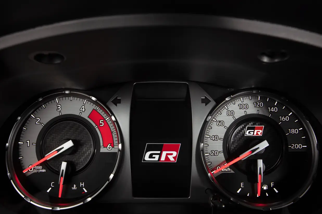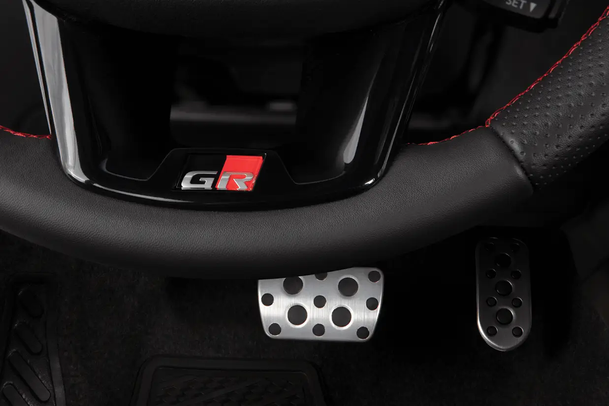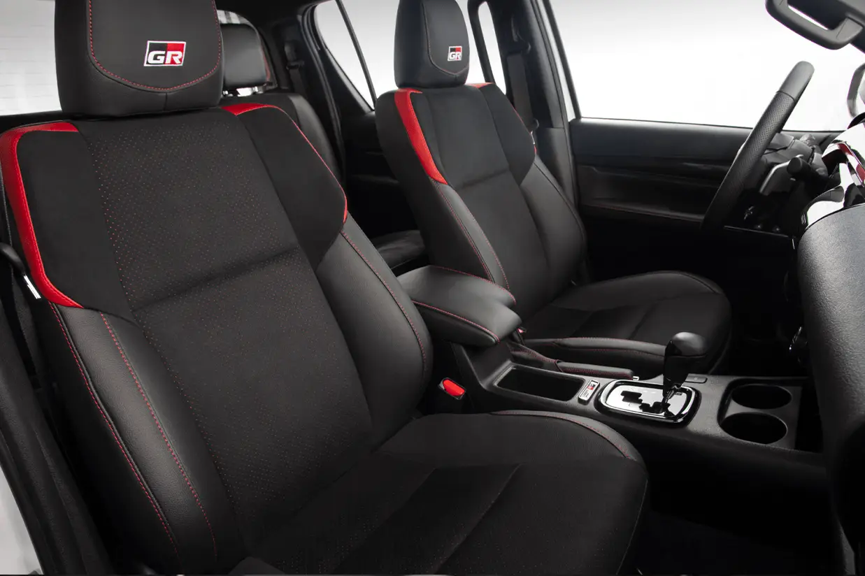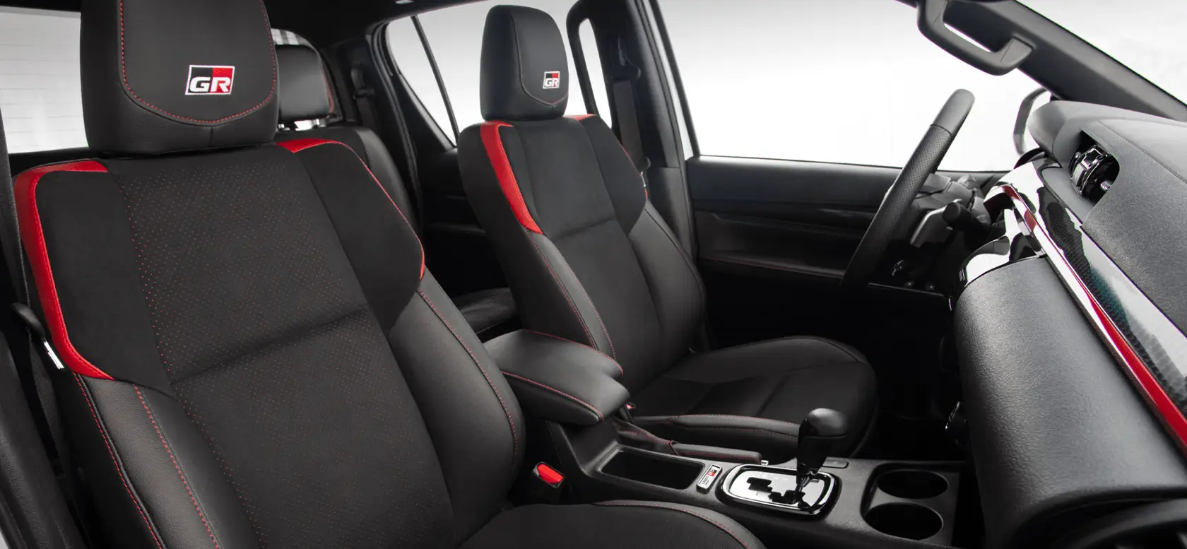 Interior que mescla couro, suede e material sintético, trazendo o DNA esportivo da Toyota Gazoo Racing